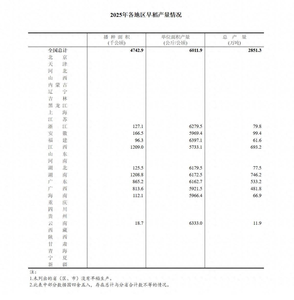 据国家统计局网站消息,根据早稻抽样调查结果推算,2025年全国早稻播种面积、单位面积产量、总产量如下: