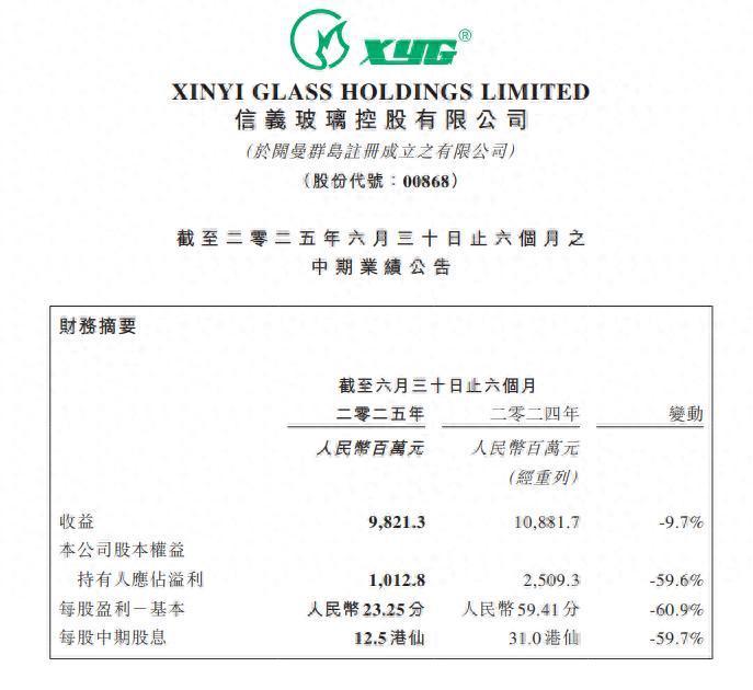 根据最新财报,2025年上半年,受浮法玻璃价格下跌及联营公司信义光能盈利减少等因素影响,信义玻璃营收和归母净利润双降,同比分别下滑9.7%和59.6%。