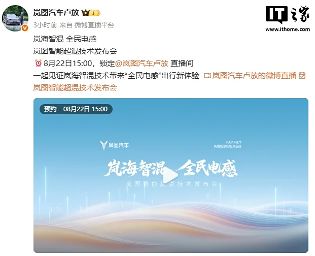 IT之家 8 月 20 日消息,岚图汽车 CEO 卢放今日在微博上宣布将于 8 月 22 日举办智能超混技术发布会。截至IT之家发文,本次发布会的具体内容暂未公布。